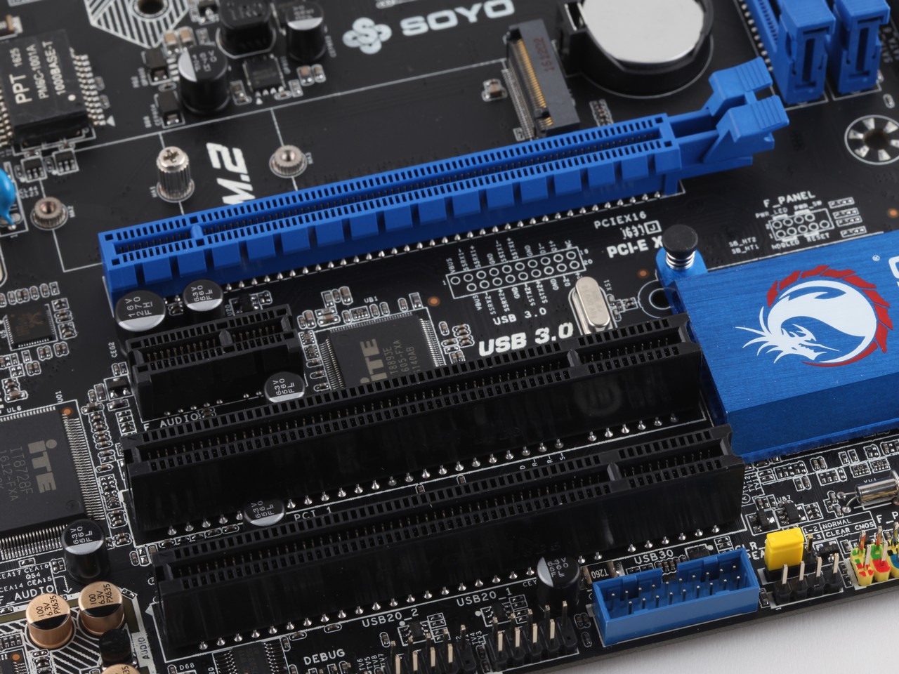 LPT+COM+PCI接口,VGA+HDMI接口,數(shù)模分割線,音頻電容,中空散熱片