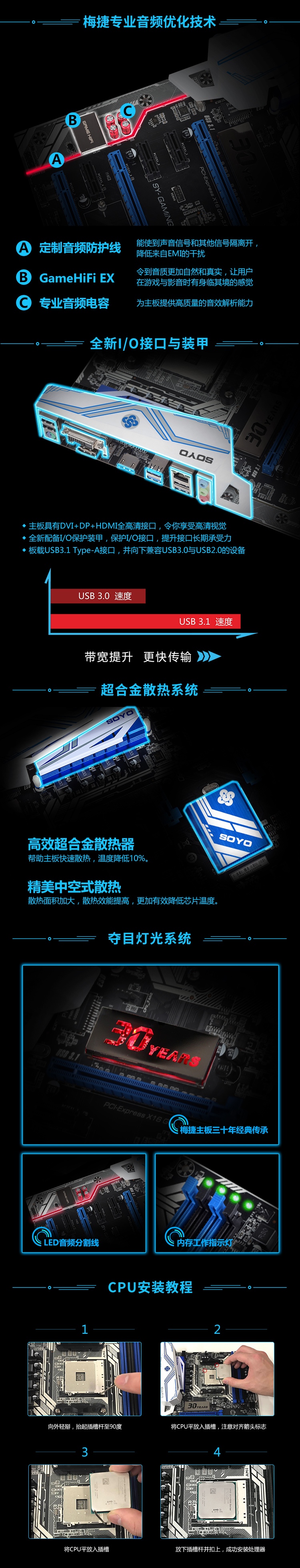 | 產品特色 | 支持8核CPU,四內存插槽,炫目燈光系統,三顯卡插槽,雙M.2接口 |