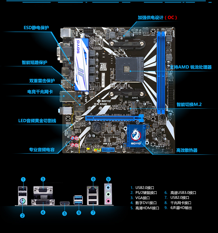 - 支持超頻,全規(guī)格M.2高速接口,顯卡插槽,2條DDR4內(nèi)存槽,六相供電,整版ESD防護,中空散熱片